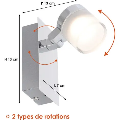 Collection Gyra 1 Spot Salle de Bain Chrome 5W 340lm 3000K IP44 1 Spot.Dimensions du produit (L x l x h) : 7,5 cm x 13,5 cm x 13,5 cm ; Classe énergétique : A+ ; Poids : 0,3 Kilogrammes ; Watt : 5W ; Batterie(s) / Pile(s) requise(s) : non ; Type de piles : non ; Matière : Aluminium ; Couleur : Chrome ; Couleur de la lumière : Chrome ; Kelvins : 3000K ; Lumens : 340 ; Etanche : oui ; Indice de protection IP : IP44 ; Technologie :